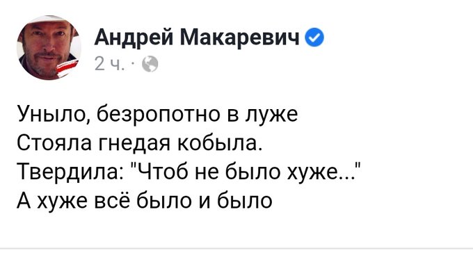 С тех пор, как запись с концерта, подпольной тогда, "Машины времени", попала в мои руки, я стал их реальным фанатом. Это было в конце 1979-го. Ну, а потом я узнал, что лидер группы - Андрей Вадимович Макаревич не только классный музыкант и поэт, но и просто очень умный человек. Интервью Андрея я всегда слушаю с громадным вниманием и интересом. Сегодня я нарвался на новый стишок Макаревича на злобу российского дня и просто не мог не поделиться им с вами...