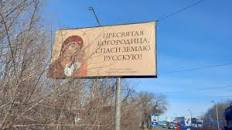Это вызывает сразу две яркие ассоциации. Первая - облёт столицы с иконой на борту в во время Второй Мировой. А так же более близкое по времени, - установление в т.н. "народных" машинах, лишённых средств активной безопасности, целых иконостасов на приборных панелях. Остаётся только догадываться, отсутствие чего, на самом деле, должны возместить собой эти иконо-баннеры.