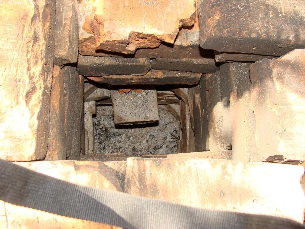 Отношение между камерой загрузки и трубой – в два раза труба выше, не меньше (а лучше в три). Иначе тяги не будет нормальной. Горизонтального туннеля почти нет, что есть очень хорошо. Энергия огня сразу в трубе оказывается. То что всё не ровно и угловато – польза! Для закручивания газа, соответственно более эффективное догорание газов. По этому принципу можно складывать печки «на пробу».