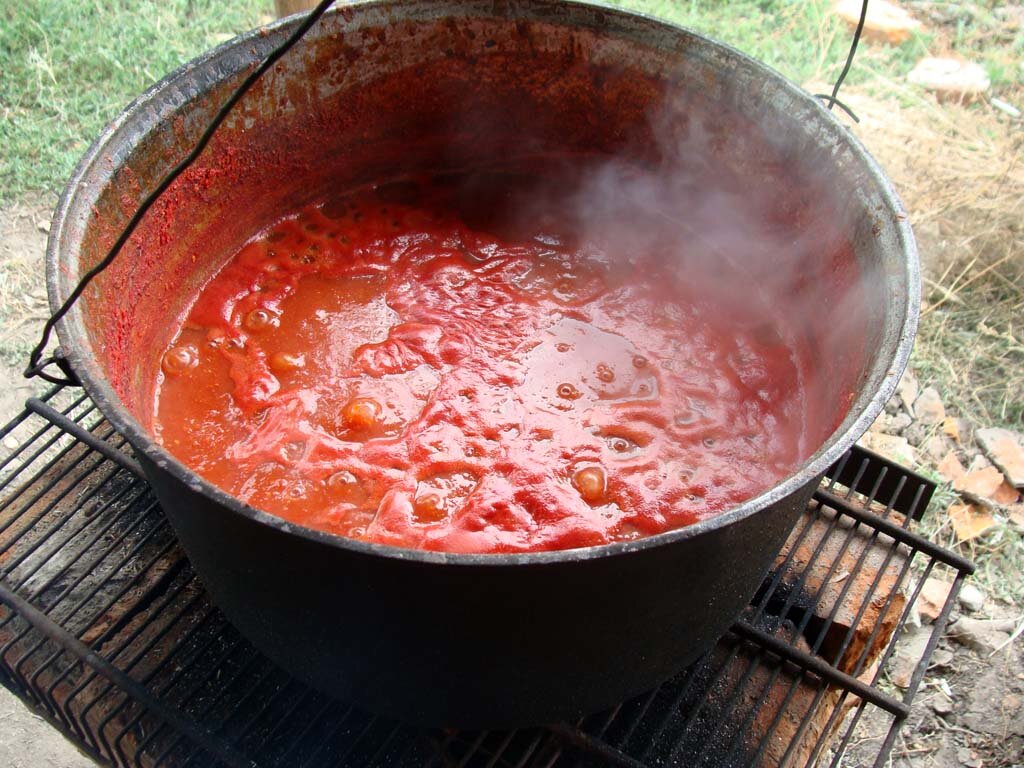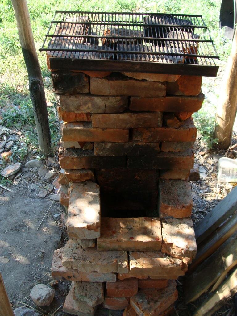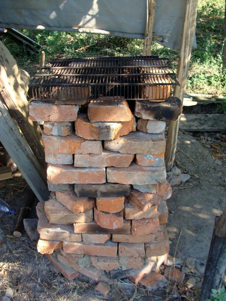 Ну и сложил. Думаю: «А зачем тут раствор?». Лень глину доставать. Помидоры – скулят: «Мы в томат хотим превратиться». Затопил как есть. Работает и не дымит! По части эффективности и времени, никакой газ и электричество и рядом не стояли! Быстро всё закипело и уварилось(без подгорания на дне).
