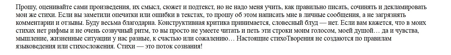 "Да, писать стихи гораздо проще, когда они идут изнутри, а не отталкиваются от теории. Тем не менее, чтобы стихотворение было не просто искренним, а красивым и наполненным смыслом, нужно хотя бы немножечко разбираться в технике."