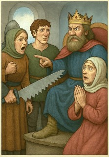 Однажды к мудрому Царю Соломону, чья слава о справедливости и проницательности гремела по всем землям, пришли две женщины. Обе были шумные, сварливые и привели с собой юношу — растерянного и не понимающего, что происходит.