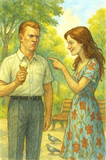 Пауза. Прапорщик завис. В голове ‑ тревога: «Провокация. Логическая засада». Сказать «да» ‑ значит согласиться, что скажешь «нет». Сказать «нет» ‑ проигрыш по определению. Молчать ‑ не по уставу. Он завис. Девушка, не дождавшись ответа, усмехнулась, развернулась и ушла, оставив после себя аромат духов и философскую катастрофу. Прапорщик с грустью посмотрел ей в след. С мороженного стекали капли прямо на землю.