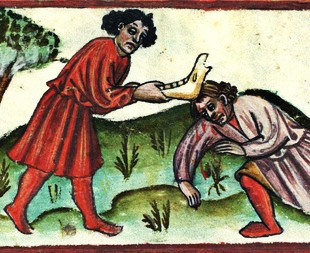 Картинка— миниатюра XV века: Каин убивает младшего брата Авеля, где челюстная кость осла является орудием этого убийства — комментарий VII века н.э. к книге Бытия, поскольку за отсутствием металла выбор орудий был очень мал, а в Библии как раз упоминается конкретная челюсть осла: ею Самсон убивал врагов. По версии иудейских каббалистических легенд Каин никакой челюстью осла брата не бьёт, зато впивается в его горло собственными зубами.