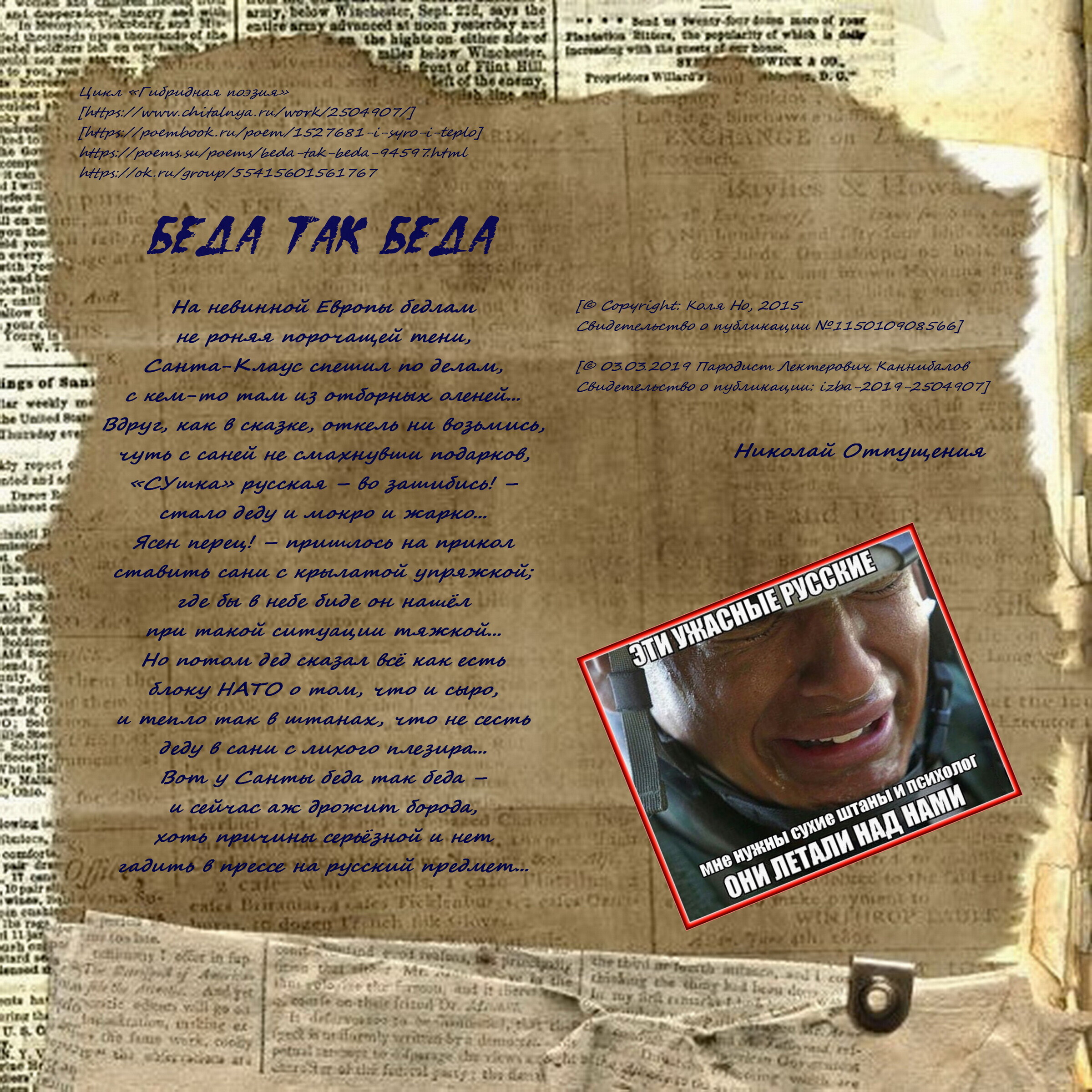 На невинной Европы бедлам не роняя порочащей тени, Санта-Клаус спешил по делам, с кем-то там из отборных оленей... Вдруг, как в сказке, откель ни возьмись, чуть с саней не смахнувши подарков, «СУшка» русская – во зашибись! – стало деду и мокро и жарко... Ясен перец! – пришлось на прикол ставить сани с крылатой упряжкой; где бы в небе биде он нашёл при такой ситуации тяжкой... Но потом дед сказал всё как есть блоку НАТО о том, что и сыро, и тепло так в штанах, что не сесть деду в сани с лихого плезира... Вот у Санты беда так беда – и сейчас аж дрожит борода, хоть причины серьёзной и нет гадить в прессе на русский предмет...