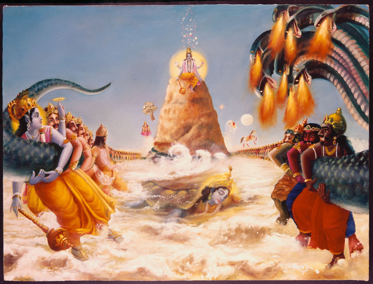 Получив преимущество, царь демонов Бали завоевал райские миры, а царь богов Индра который к тому же потерял удачу из за оскорбления святого, потерпел поражение . Так сместился баланс во вселенной. Эта история о том как на заре творения, Боги стали молиться Всевышнему а Он, явившись к ним и рассказав что делать, пообещал Лично помочь в решении их проблем ... Дар Богам.