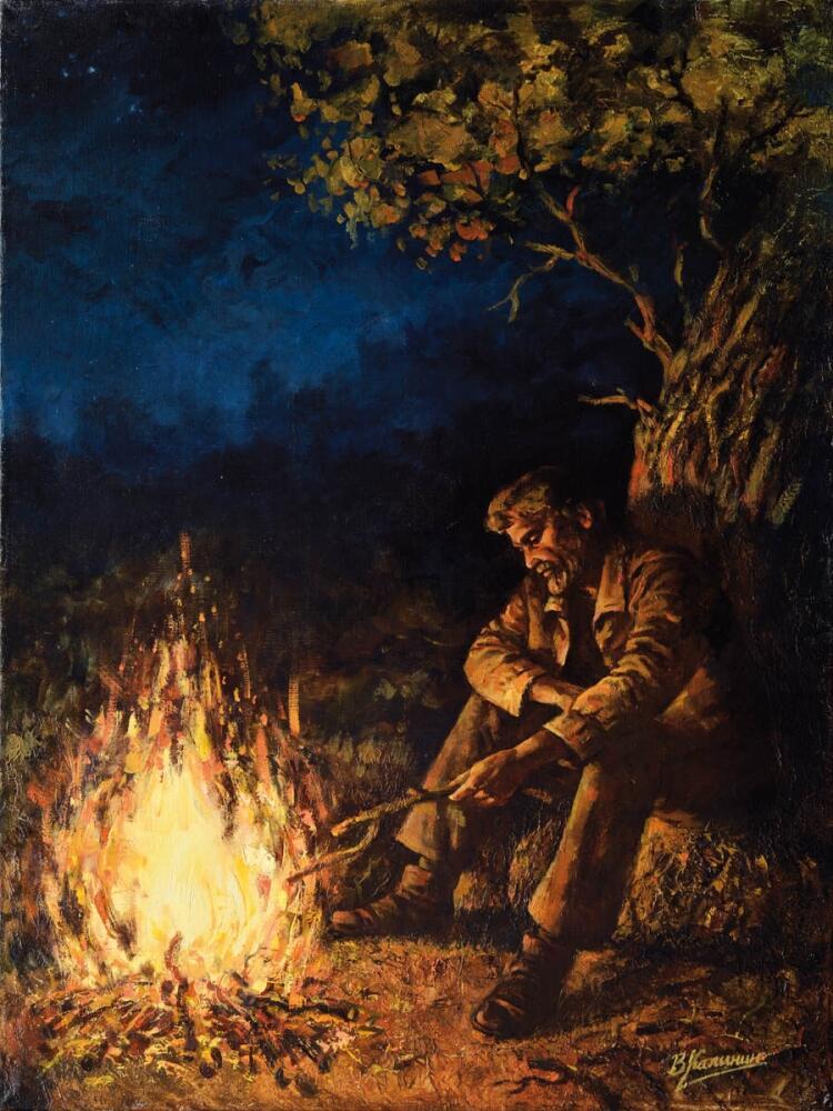 Рукою колено накрыв он сидел