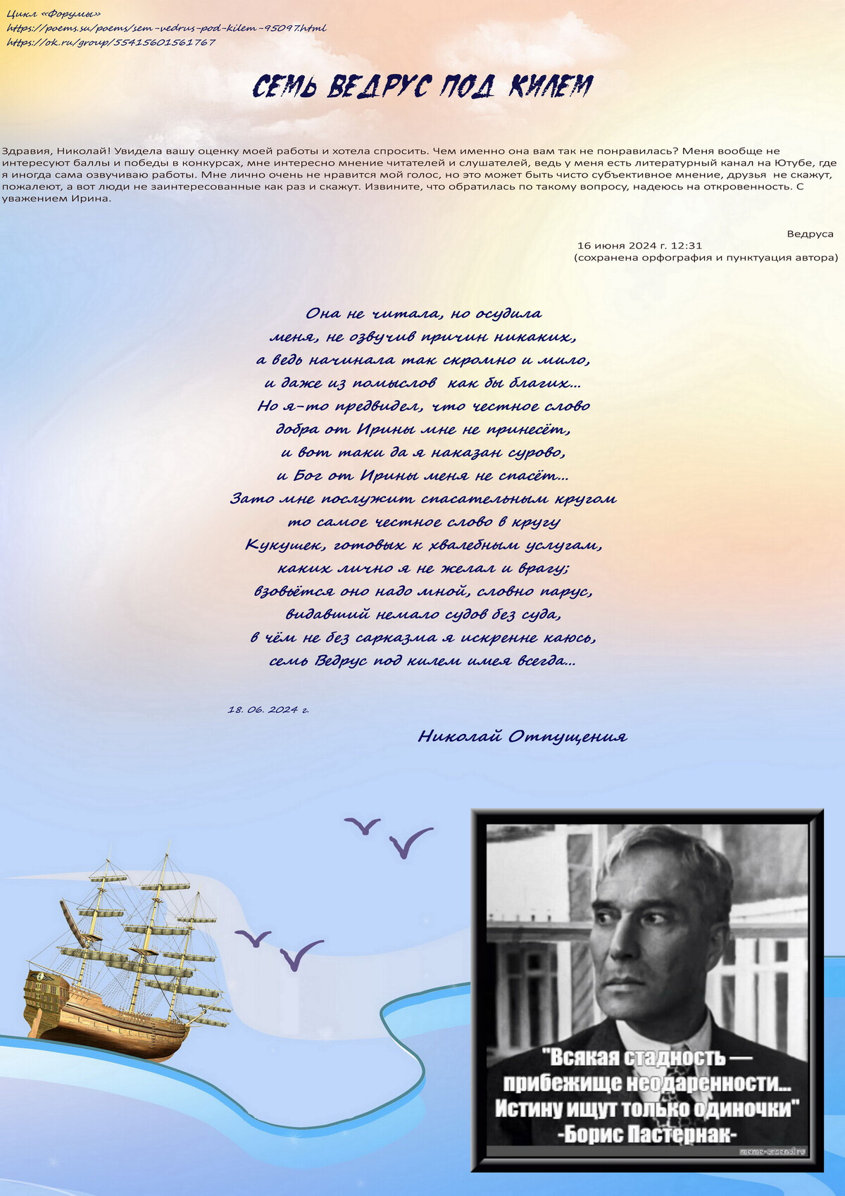 Здравия, Николай! Увидела вашу оценку моей работы и хотела спросить. Чем именно она вам так не понравилась? Меня вообще не интересуют баллы и победы в конкурсах, мне интересно мнение читателей и слушателей, ведь у меня есть литературный канал на Ютубе, где я иногда сама озвучиваю работы. Мне лично очень не нравится мой голос, но это может быть чисто субъективное мнение, друзья не скажут, пожалеют, а вот люди не заинтересованные как раз и скажут. Извините, что обратилась по такому вопросу, надеюсь на откровенность. С уважением Ирина.
