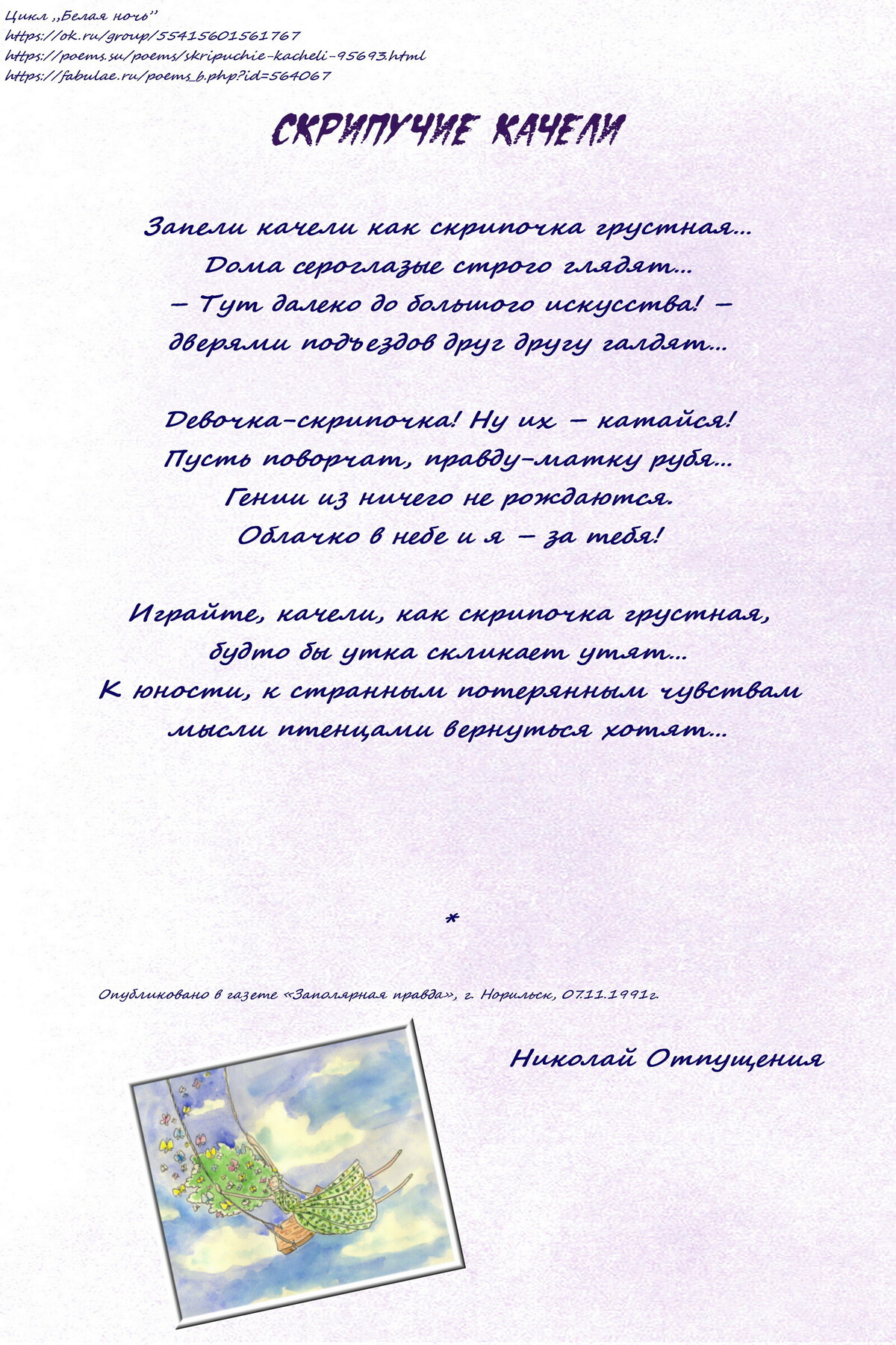 Играйте, качели, как скрипочка грустная,