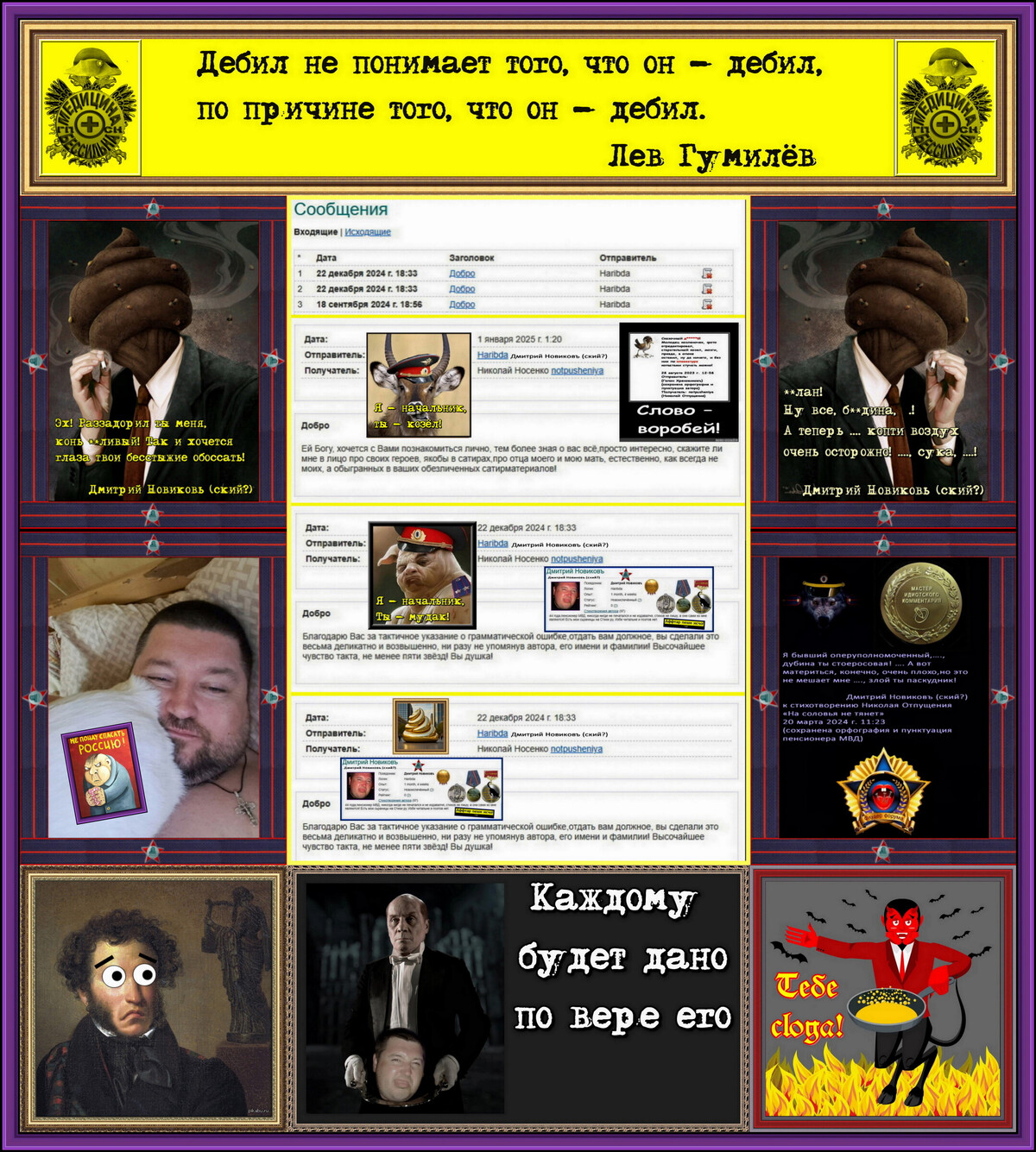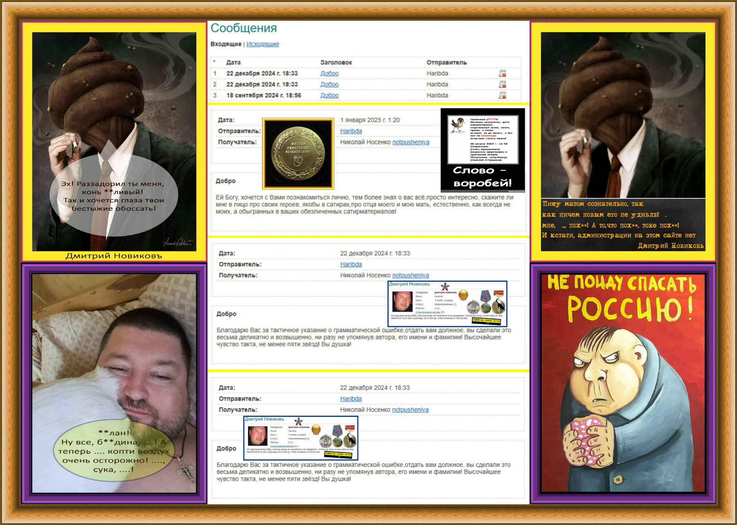 И вынужден напомнить этому энурезному склеротику и всем, кто не в курсе дела, что начал он мне хамить не с той сатиры, в которой я представил его родителей, вырастивших из него малограмотного маниакального хама, такими, с каких он вполне мог скопировать быдляцкую модель поведения – он начал мне хамить с первой прочитанной им моей публикации, в которой без всяких имён и фамилий узнал себя-любимого (см. первую цитату) так что вовсе не за своих высокоинтеллигентных родителей Димоня впоследствии крыл меня матом и козлом обзывал со товарищи по быдлизму, а только из „личностных” гопнических побуждений взялся на зеркало пенять...