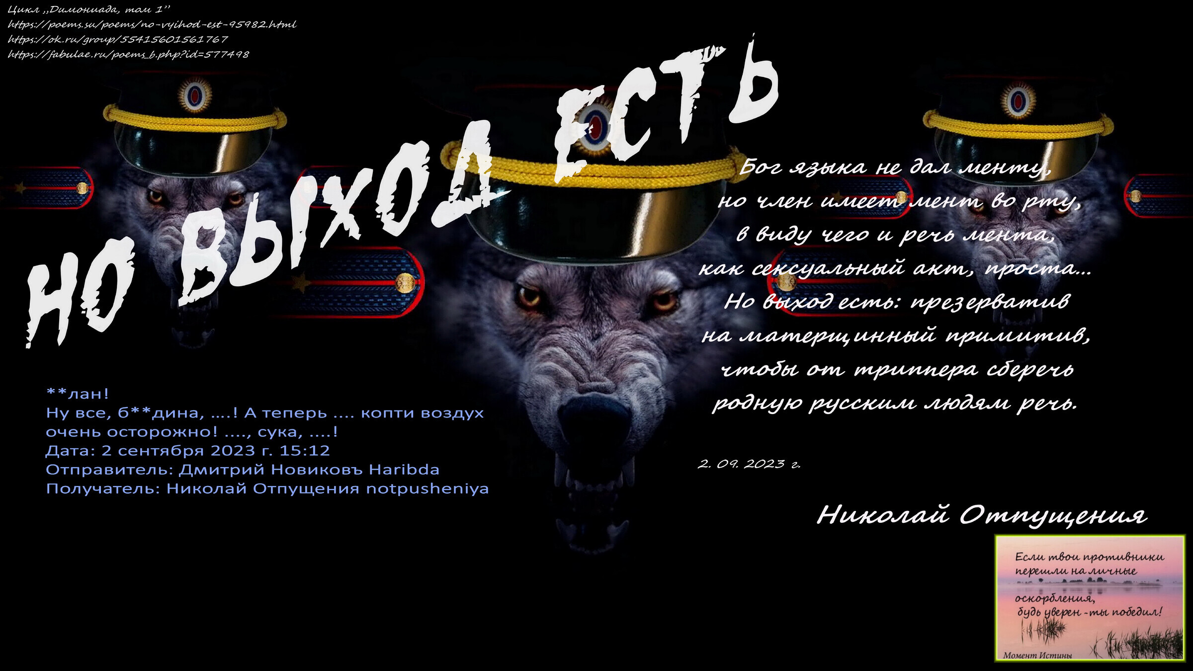 Бог языка не дал менту, но член имеет мент во рту, в виду чего и речь мента, как сексуальный акт, проста… Но выход есть: презерватив на матерщинный примитив, чтобы от триппера сберечь родную русским людям речь.