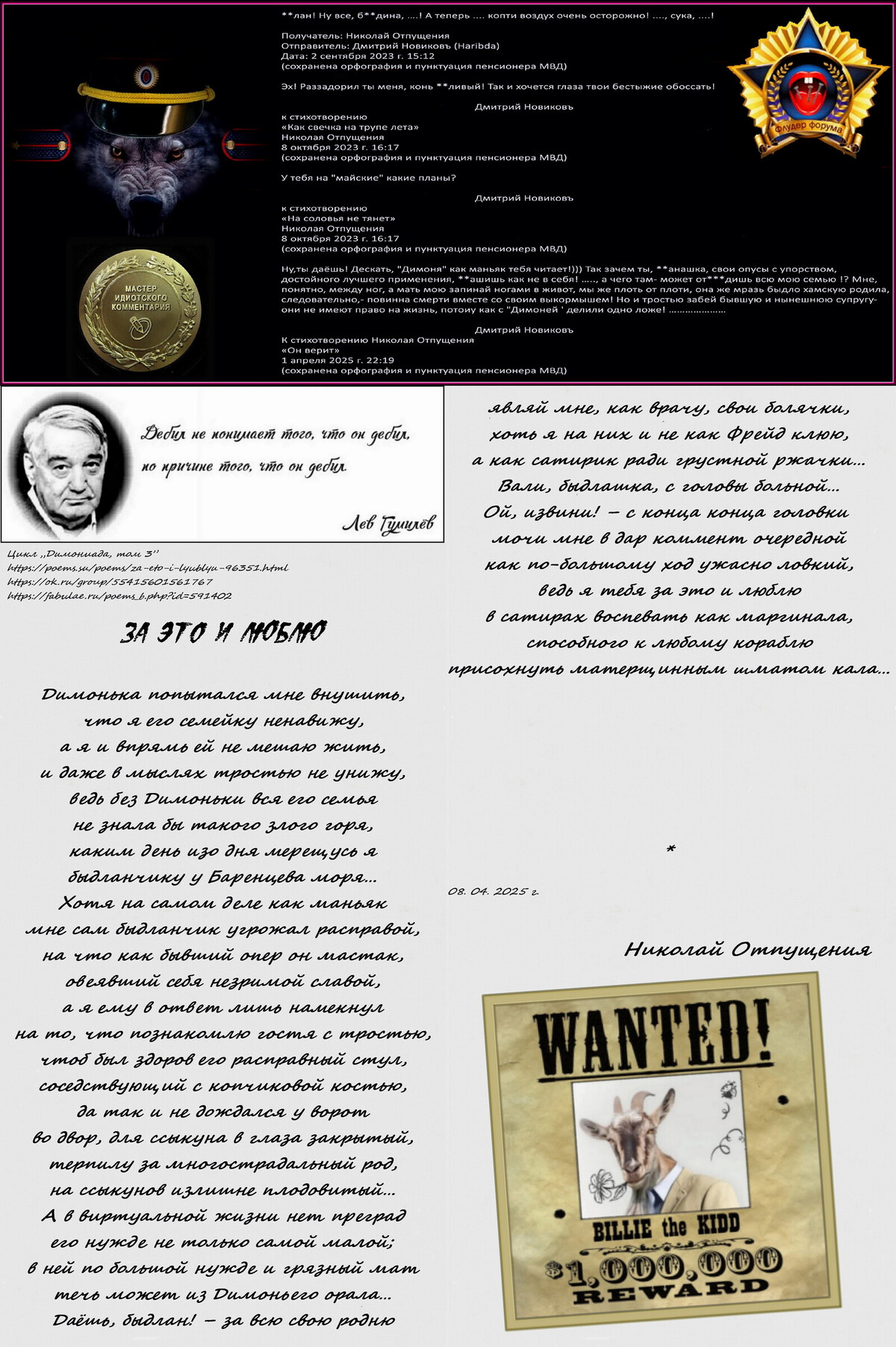 Ну,ты даёшь! Дескать, "Димоня" как маньяк тебя читает!))) Так зачем ты, **анашка, свои опусы с упорством, достойного лучшего применения, **ашишь как не в себя! ….., а чего там- может от***дишь всю мою семью !? Мне, понятно, между ног, а мать мою запинай ногами в живот, мы же плоть от плоти, она же мразь быдло хамскую родила, следовательно,- повинна смерти вместе со своим выкормышем! Но и тростью забей бывшую и нынешнюю супругу- они не имеют право на жизнь, потоиу как с "Димоней ' делили одно ложе! …………………