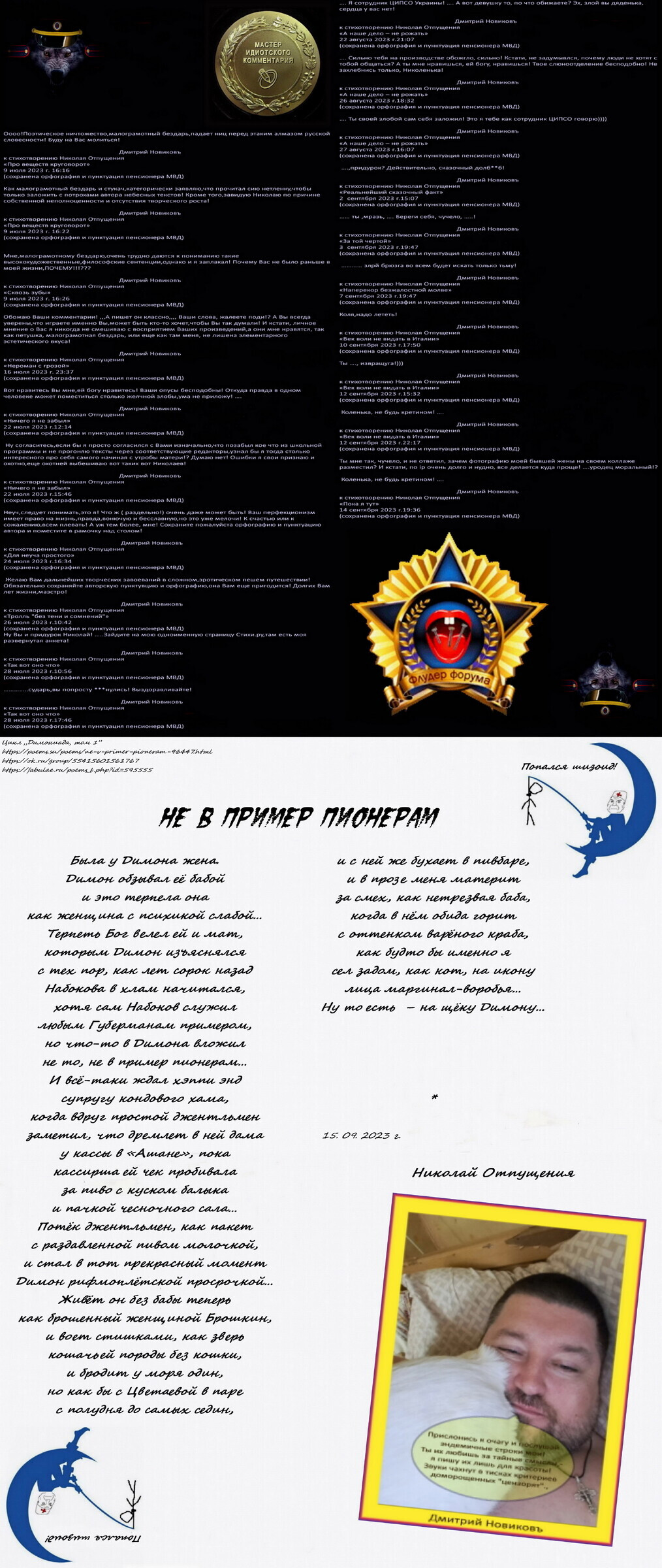 Как малограмотный бездарь и стукач,категорически заявляю,что прочитал сию нетленку,чтобы только заложить с потрохами автора небесных текстов! Кроме того,завидую Николаю по причине собственной неполноценности и отсутствия творческого роста!