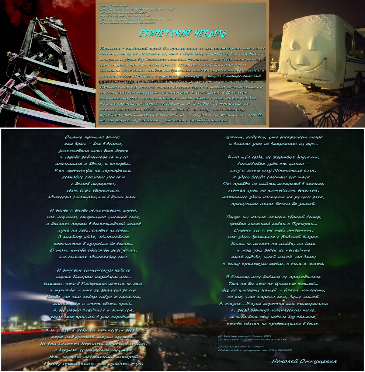 Норильск - особенный город. Он органически не принимает тех, кто его не любит, хотя, по мнению тех, кто в Норильске никогда не был или был, но струсил и удрал без выходного пособия, Норильск - это всего лишь убогая и серая территория длинного рубля. Но этот самый длинный рубль является всего лишь плодом воображения жадных и завистливых людей, а на самом деле Норильск - это тяжёлый труд и жизнь в экстремальном климате. Любить город, как и человека, за что-то - это не любовь, а Норильск можно любить только вопреки всему и только по-настоящему любящим его он отвечает взаимностью. К сожалению, в Норильске слишком трудно жить старикам и расставание с ним неизбежно для всех, но бывших норильчан не бывает... Я не родился в Норильске, но именно его считаю своей малой родиной, потому что отдал ему тридцать три самых лучших года своей жизни и встретил там любовь на всю жизнь... А Кайеркан – это район города Норильска…