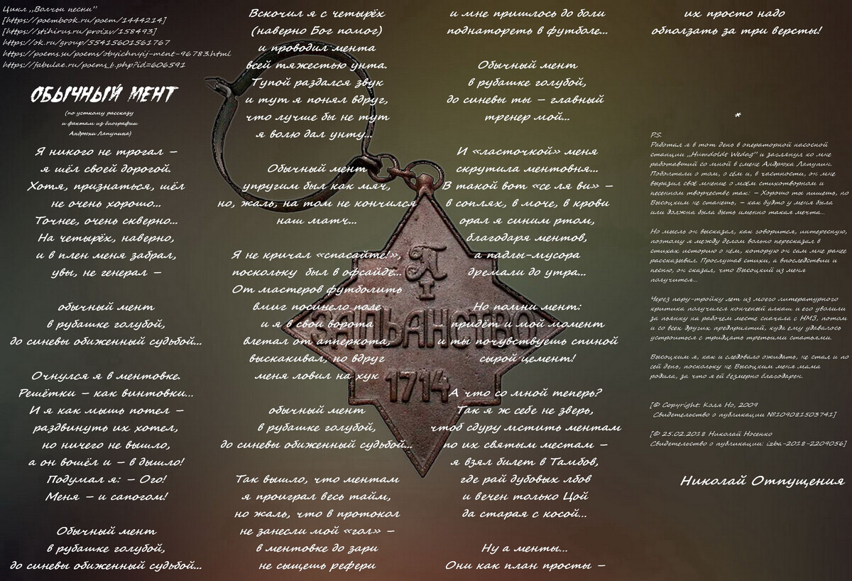 Послесловие: Работал я в тот день в операторной насосной станции „Humdoldt Wedag” и заглянул ко мне работавший со мной в смене Андрюха Лапупин. Поболтали о том, о сём и, в частности, он мне выразил своё мнение о моём стихотворном и песенном творчестве так: – Хорошо ты пишешь, но Высоцким не станешь, – как будто у меня была или должна была быть именно такая мечта…