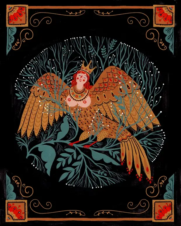 ** Алконост - птица-дева из славянской мифологии, олицитворяющая радость и свет; её пение утешает и приносит умиротворение.