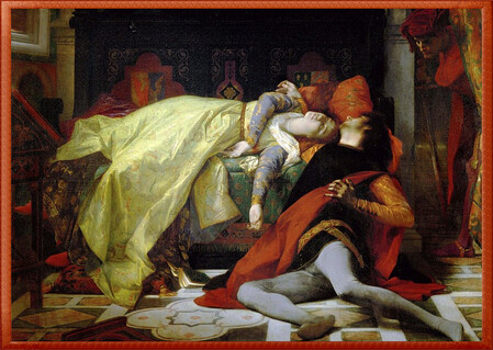 Картинка — репродукция картины «Паоло и Франческа» (1857 год) французского живописца Александра Кабанеля на сюжет, описанный Данте Алигьери в его «Божественной комедии». Трагическая история любви Паоло и Франчески, описанная Данте в 5 песне «Ада», вызывала наибольшее вдохновение у художников того времени: юная красавица Франческа да Римини, дочь правителя Равенны, была насильно выдана замуж за Джанчотто Малатеста — злобного, хромого, но знатного уродца, но сама страстно влюбилась в Паоло, младшего брата своего супруга. Когда тот застал их за прелюбодеянием, то заколол обоих любовников. Пытаясь спасти возлюбленного Франческа прикрыла Паоло собой и приняла первый удар на себя. Но ослеплённый безумной ревностью и яростью, Джованни добил брата вторым ударом ножа. Возможно, эта трагичная история любви так и осталась бы за стенами старой крепости Равенны, если бы не современник Франчески и Паоло — Данте Алигьери, который поведал о ней в своей "Божественной комедии": путешествуя с Вергилием по кругам Ада, Данте увидел мужчину и женщину, так и не разомкнувших объятий в вечном вихре Дьявольского огня.