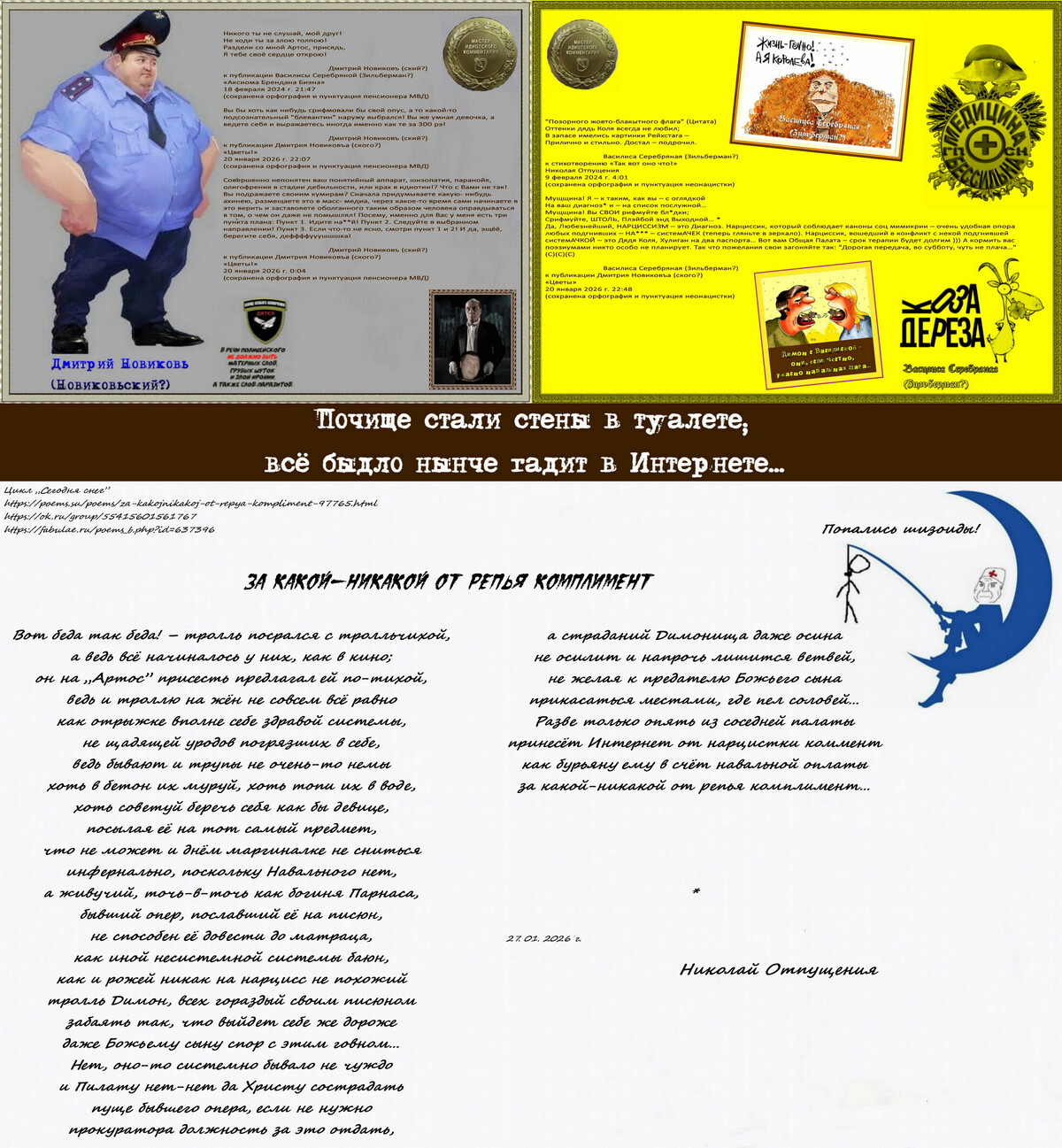 Мущщина! Я – к таким, как вы – с оглядкой На ваш диагноз* и – на список послужной… Мущщина! Вы СВОИ рифмуйте бл*дки; Срифмуйте, ШТОЛЬ, Плэйбой энд Выходной… * Да, Любезнейший, НАРЦИССИЗМ – это Диагноз. Нарциссик, который соблюдает каноны соц мимикрии – очень удобная опора любых подгнивших – НА*** – системАЧЕК (теперь гляньте в зеркало). Нарциссик, вошедший в конфликт с некой подгнившей системАЧКОЙ – это Дядя Коля, Хулиган на два паспорта… Вот вам Общая Палата – срок терапии будет долгим ))) А кормить вас поэзиумами никто особо не планирует. Так что пожелания свои загоняйте так: "Дорогая передача, во субботу, чуть не плача…" (С)(С)(С)