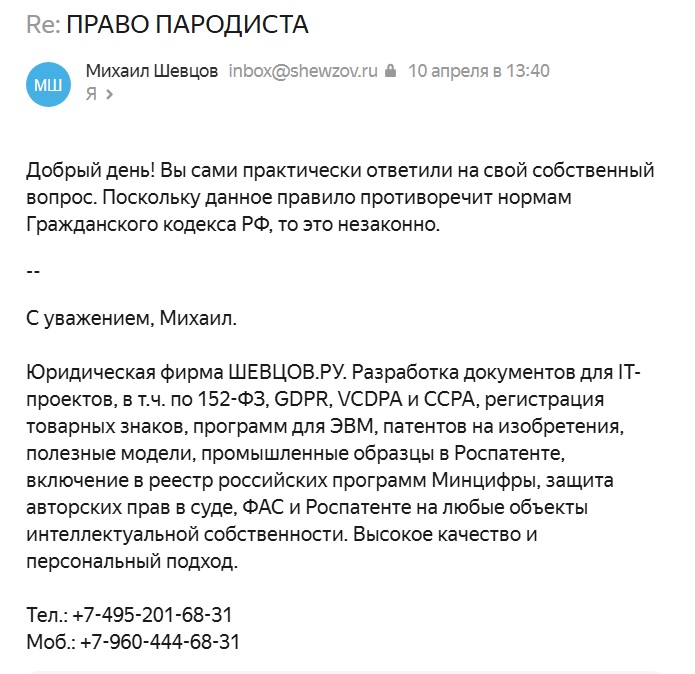 Вопрос юристу, который занимается литературными спорами: "....Если местное правило ставится выше пункта 4 статьи 1274 Гражданского кодекса РФ, согласно которому такое разрешение не требуется. Законно ли это?