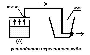 Имеется в виду использование аппаратов, построенных по образцу «перегонного куба». Он состоит из двух емкостей. В одну наливают раствор, который необходимо «перегнать». Емкость подогревают, чтобы раствор испарялся. Пар по трубке выходит из емкости и проточным способом проходит через вторую емкость: охладитель. Там пар конденсируется, и на выходе мы получаем очищенную жидкость. То есть основное назначение перегонного куба (по-другому «дистиллятора») – очистка жидкостей от примесей.