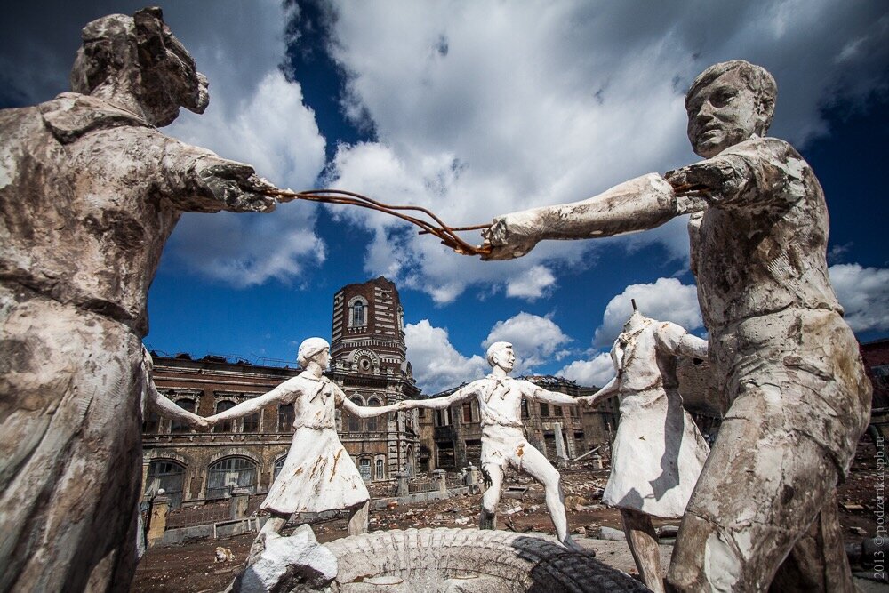 На фоне покорёженных зданий железнодорожного вокзала и привокзальной площади скульптуры детей на постаменте танцевали вокруг крокодила. Фонтан был цел. Только вместо сцепленных детских рук торчала металлическая проволока.