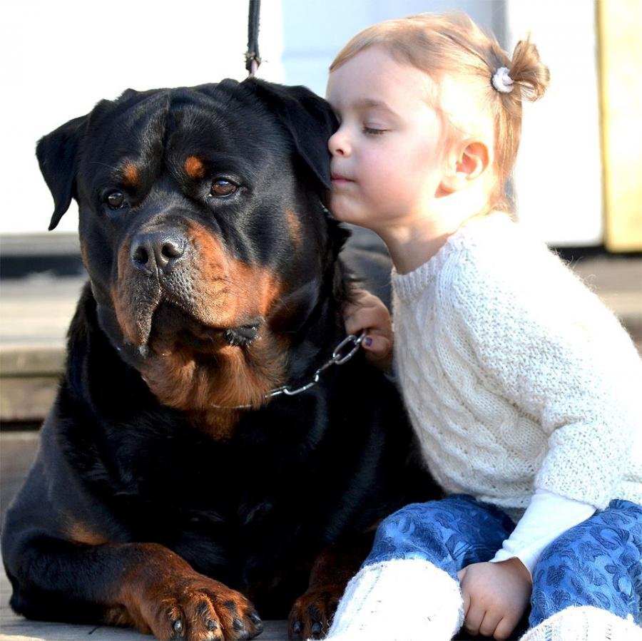 Был период, когда в одной квартире оказались две большие собаки: ньюфаундленд Джина и ротвейлер Урфи. Подружились они сразу. Сильная, агрессивная для чужих Урфи, взяла шефство над Джиной и относилась к той покровительственно: подпускала первой к миске с кашей, «защищала» на улице. Гуляли с Урфи на поводке с намордником, Джина шла свободно рядом. Ей давали поводок в зубы, и она вела на привязи Урфи.