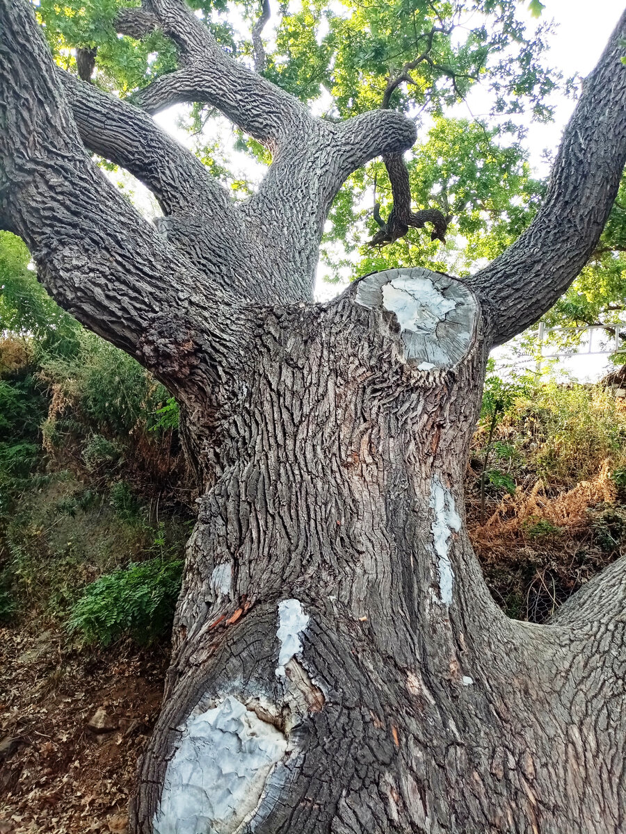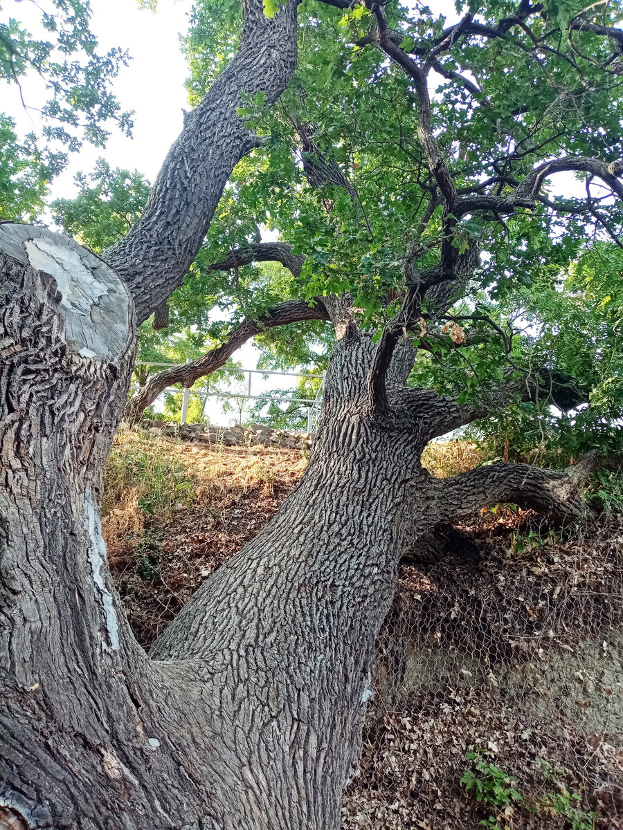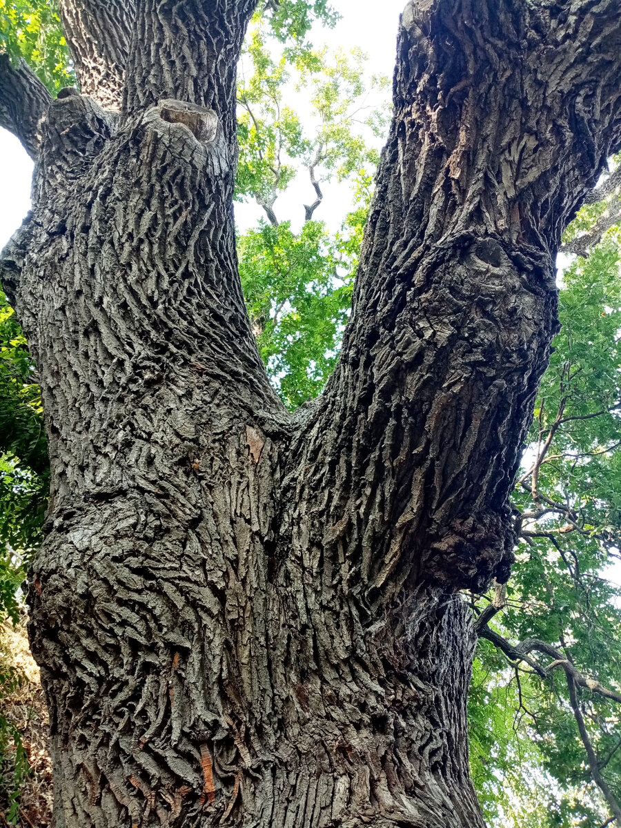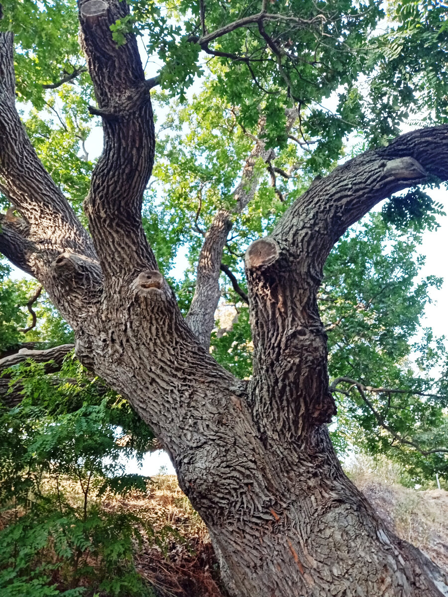 Но нам вперед, к дубам! Пешком по заброшенной территории. С Божье помощью, полученной в монастыре, нога моя идёт и идёт неплохо! И, наконец, мы у цели! Дуб-патриарх. Это дерево - настоящий исполин, ствол в обхвате - около 6 метров, высота - 18 метров. С 1993 по 2006 год дуб-патриарх являлся ботаническим памятником природы регионального значения, а с 2006 года — местного значения, а 3 сентября 2015 года состоялась торжественная церемония присвоения Дубу-патриарху статуса памятника живой природы федерального значения.