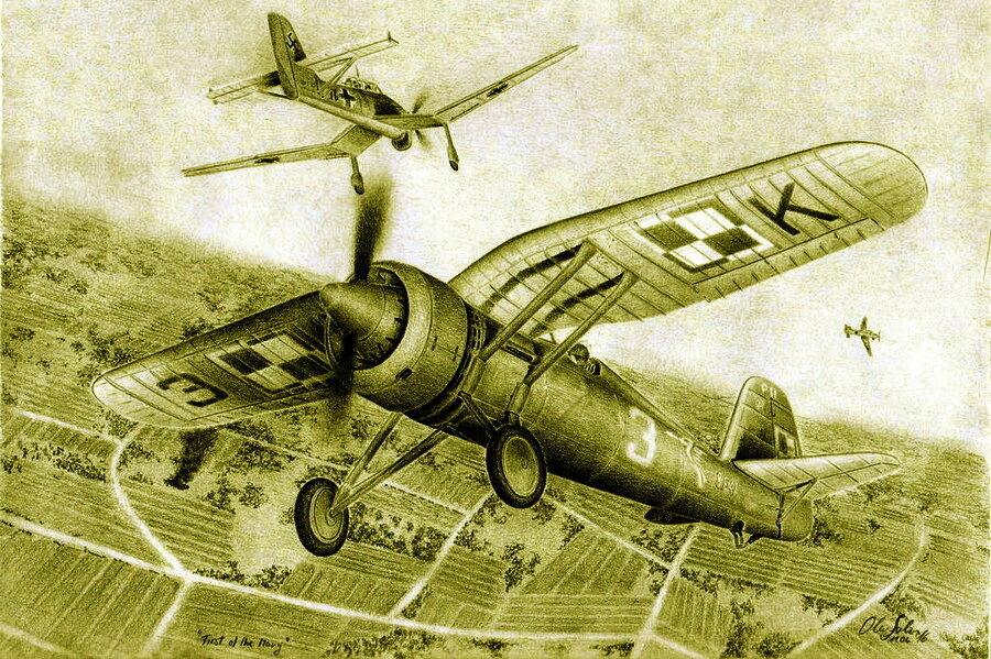 А вот первая воздушная победа 2МВ состоялась практически в это же время, когда группа немецких "Юнкерс" Ju-87 из I группы эскадры StG 2 "Иммельман" возвращалась из первого боевого вылета и наткнулась на пару польских истребителей. В кабинах двух PZL P.11c, взлетевших на патрулирование с полевого аэродрома Балице под Краковом, сидели командир III истребительного дивизиона 2-го авиационного полка капитан Мечислав Медвецкий (Mieczysław Medwecki) и лётчик входившей в этот дивизион 121-й истребительной эскадрильи подпоручик Владислав Гнысь (Władysław Gnyś).