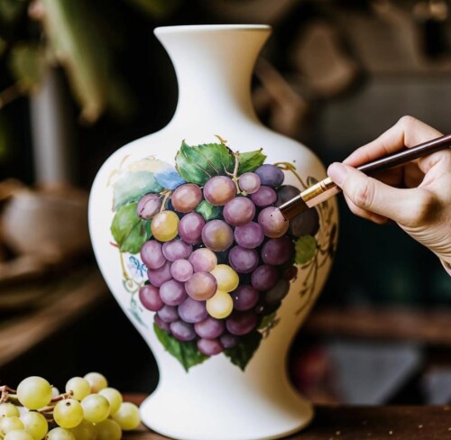 Для начала попробовал сюжет попроще, с вазой: Крупным планом фарфоровая ваза, и рука, рисующая на ней кисть винограда.