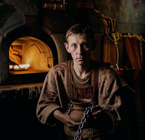Получилось, хотя и не так изящно, как хотелось. Следующее задание было сложнее: Гончарная печь, к ней цепью прикован мастер с глиняной вазой.
