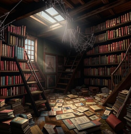 Я решил попробовать дать Интеллекту задание в аллегорической форме: Пыльный чердак моей памяти: стеллаж с книгами, на полу книги, журналы и отверстие в полу, в котором виднеется лестница, всё в паутине ( таким способом я хотел визуализировать мою досаду на свою память: в голову много чего напихано, но попробуй найти там что-то нужное!).