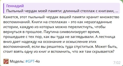 Немного поэкспериментировав с кнопками, картинку я всё таки получил, хотя чересчур детализированную и "не в комплекте" - не было в ней лестницы. Наверное, лестница, ведущая вниз, для ИИ - это нонсенс!. А вот ИИ - Литератор с заданием справился почти на пятёрку - единственная его ошибка в том, что книги на тех стеллажах символизировали не неразгаданные, а забытые истории...