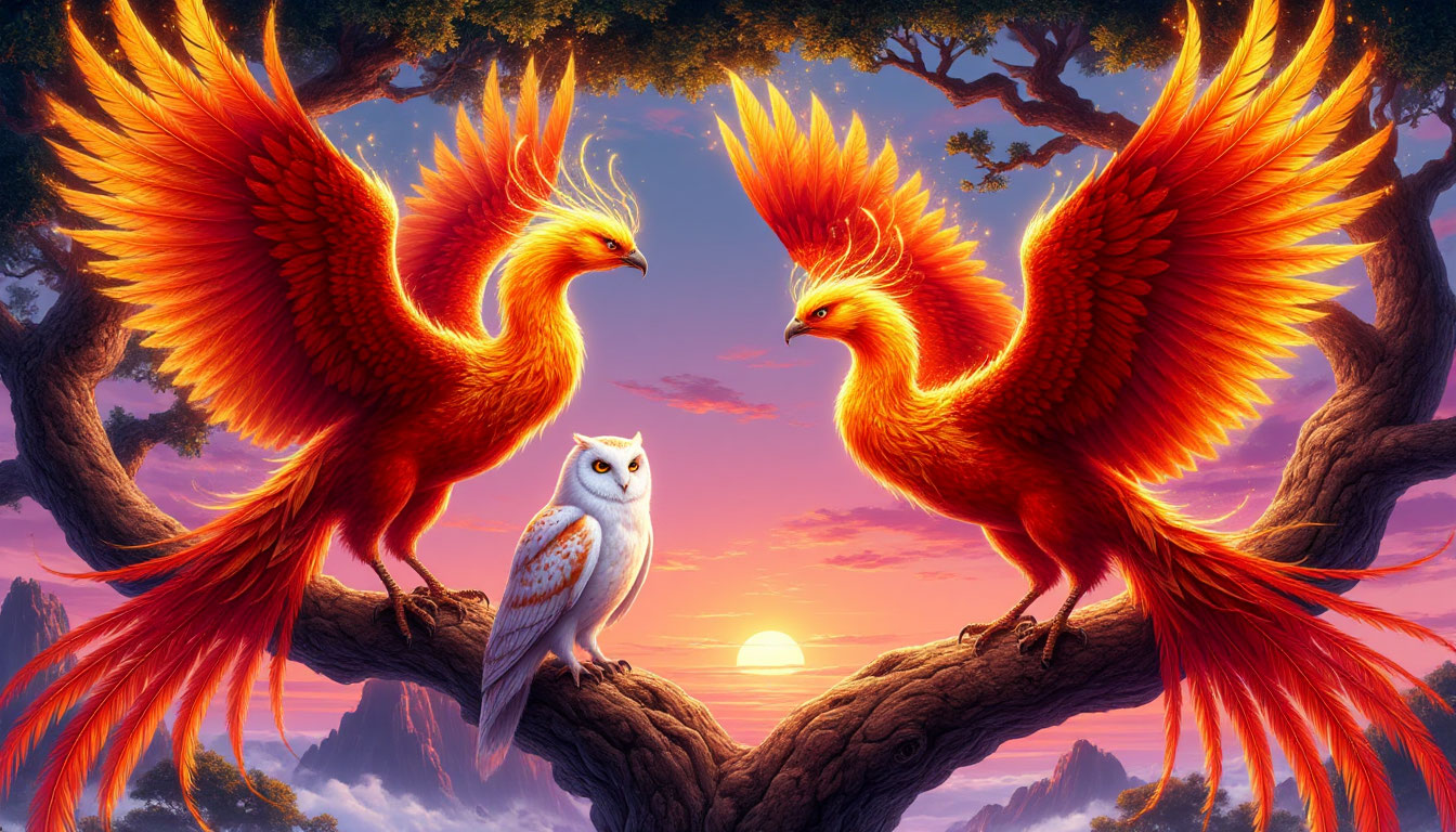 Однажды два прекрасных феникса приземлились на крепких ветках дуба. Их яркие крылья переливались как драгоценности, сверкая на солнце. Едва заметные белые пятна серебрились на шее. Крупный феникс сердито склонил голову:
