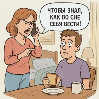 Я завис. То есть, я не только виноват, но ещё и наказан! Получается, теперь мне надо извиняться за то, что мой мозг не контролирует её сны? А если завтра ей приснится, что я купил ей шубу? Мне тогда её покупать или просто получить благодарность за виртуальный подарок? Сижу, жую сухой тостерный хлеб, размышляю: «Может, мне тоже начать мстить за сны?». Примерно так: