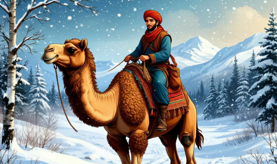 Дед Мороз видел, как Арыстан и его верный спутник содрогаются от холода. Обратной стороной посоха он прикоснулся к юноше, затем к озябшему кораблю пустыни и произнёс: «Вам стало тепло!» И в этот миг Арыстан перестал дрожать как осиновый лист, а с верблюда посыпались сосульки.
