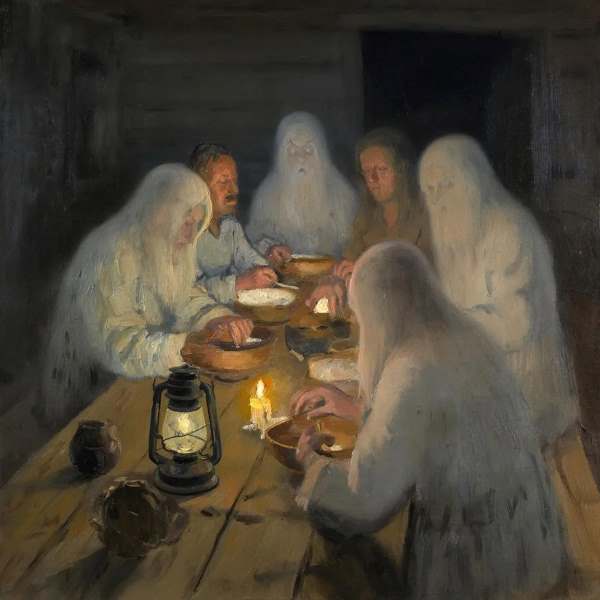 Наконец приготовление были завершены, стол был накрыт так плотно, что буквально ломился от яств, вызывавших у Льва нескончаемое слюноотделение. Когда совсем стемнело, бабка зажгла керосиновую лампу и свечу, погасив во всём доме свет. Они вместе сели на лавочку вдоль дальней стены дома принявшись ждать гостей. Перед этим Марфа приказа Льву переодеться в простую льняную рубаху до колен.