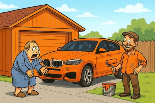 На лице хозяина полуденная ирония сменилась ледяным ужасом. Он сорвался с шезлонга и рванул к гаражу так, что шёлковый халат затрепетал, как парус. Возле гаража стоял его новенький, иссиня-черный BMW X6. Или, точнее, теперь он стоял. Блестящий, глянцевый, идеально выкрашенный… в ярко-оранжевую краску для деревянного забора. Васька, стоя сзади, вежливо добавил: