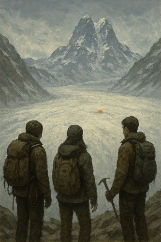 На плато их накрыл туман. Не обычный, сырой и белый, а какой-то густой, зернистый, почти физически ощутимый. В нём глохли звуки. Они встали лагерем у подножия ледовой стены, их крошечная палатка казалась единственной точкой реальности в молочном хаосе.