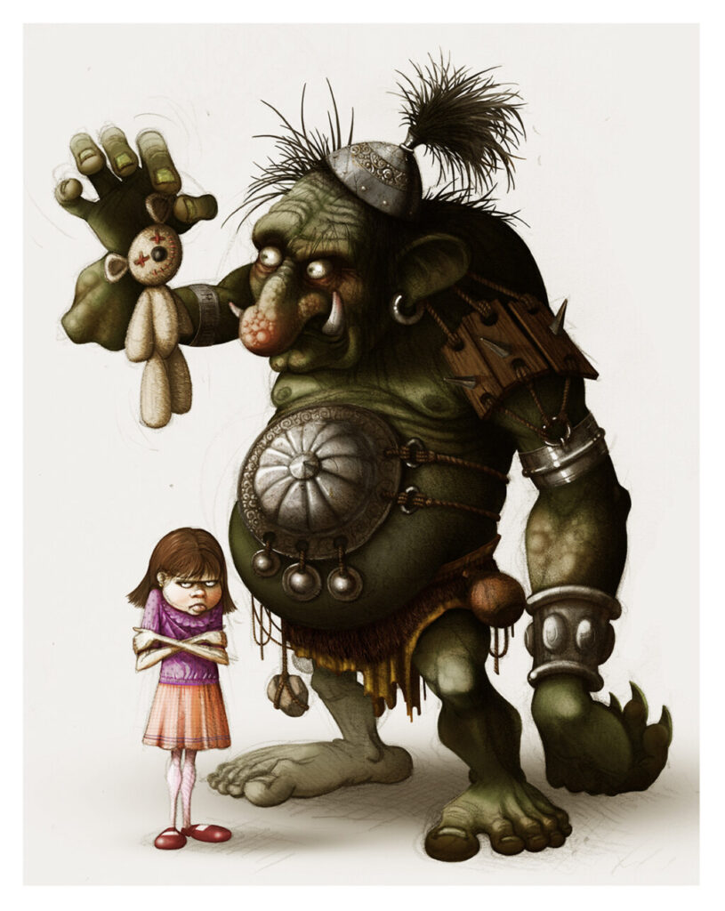 Но Дубс, конечно, об этом не знал. Поэтому ничего не понял, когда увидел маленькую девочку, убегавшую от разъярённого крылато-серого облака. Тролль встал посередине дороги и, раскрыв рот, смотрел, не зная, что делать дальше. И тут прямо в него, задыхаясь от страха и бега, врезалась девчонка и упала у его лап. Ноги её уже не держали, а обойти неожиданно возникший столб не хватило сил. Опустив свою огромную лапу, Дубс легко приподнял ребёнка, посадил на плечо и, довольный, зашагал в лес.