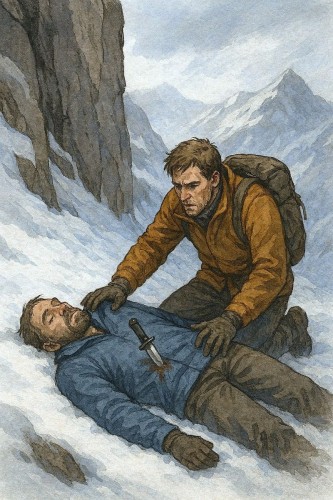 В наступивших сумерках, Стив увидел стоящую на небольшой площадке палатку. Предстояло ещё обойти небольшой скальный массив, а там уже рукой подать до палатки. Зайдя за скалу, Стив неожиданно наткнулся на тело Гюнтера. Гюнтер лежал на снегу лицом вниз, подогнув под себя правую руку. Стив наклонился к Гюнтеру, пытаясь нащупать пульс на шее, но тело уже было холодное. Стив понял – Гюнтер мёртв! С трудом перевернув Гюнтера на спину, Стив увидел, что нож, зажатый в правой руке Гюнтера, был воткнут по самую рукоять в сердце. Скорее всего, Гюнтер споткнулся и упал. В тот момент, он держал в руке свой любимый нож, на который и упал со всего размаха. Напоролся на нож – Нож Возмездия!