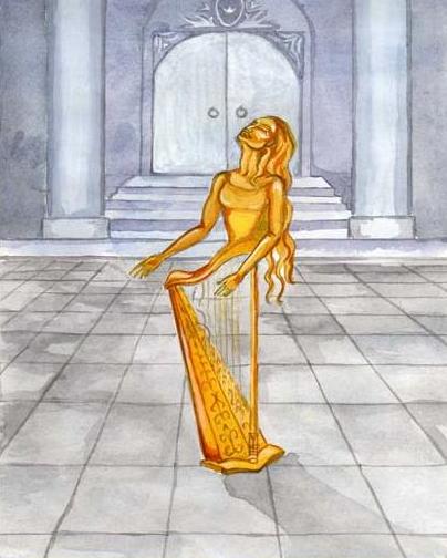 Несмелыми тихими шагами вошёл принц в темноватые залы сокровищницы. Подошёл он к Арфе, что внимательно смотрела на него, и несколько минут неподвижно стоял. А потом она вдруг улыбнулась ему, но ничего не сказала. И принц, пуще прежнего очарованный её красотой, вернулся в тронный зал.