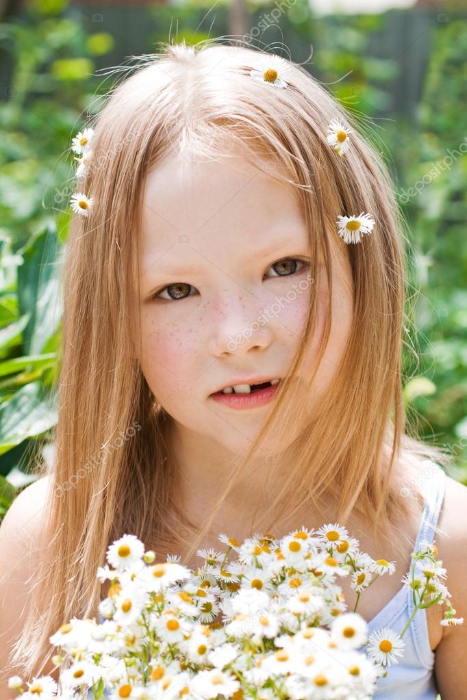 На нее смотрели большие, почти черные глаза, девчушки, в руках которой был тоже букет ромашек.