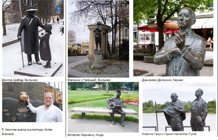 На коллаже некоторые работы Р.Квинтаса и сам скульптор возле скульптуры успеха бизнеса в Вильнюсе.