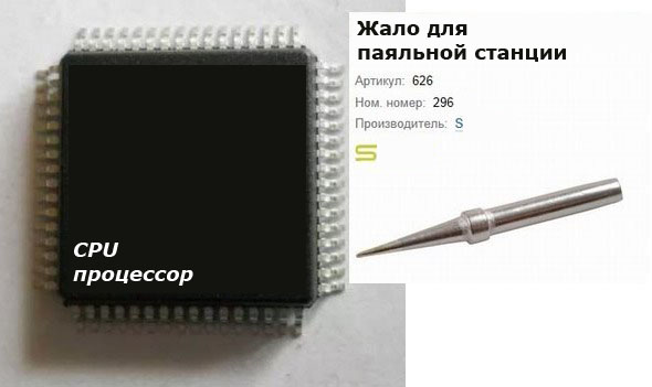 Мой знакомый посмотрел на то, что зарплата стала значительно снижаться. И уехал к себе домой в регион. Наверное, электриком работает. Но ремонт аппаратуры, как хобби, остался. Звонит мне: «Пришли мне жало для паяльника.» «У тебя же есть! Сломалось что ли?», «Нет. Мне нужно несгорающее, тонкое, острое». Я удивляюсь: «Тебе-то зачем? Такие жала только на паяльные станции ставят.» Он отвечает с неохотой: «Микросхему заменить. А то я своим бревном в 3 миллиметра ничего не могу сделать.»